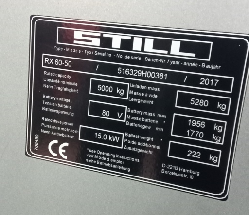 Hersteller: Still Typ: RX60-50 Bauart: Elektro 4 Rad-Stapler Antriebsart: Elektro Tragkraft: 5000 kg Baujahr: 2017 Betriebsstunden: 7567 |